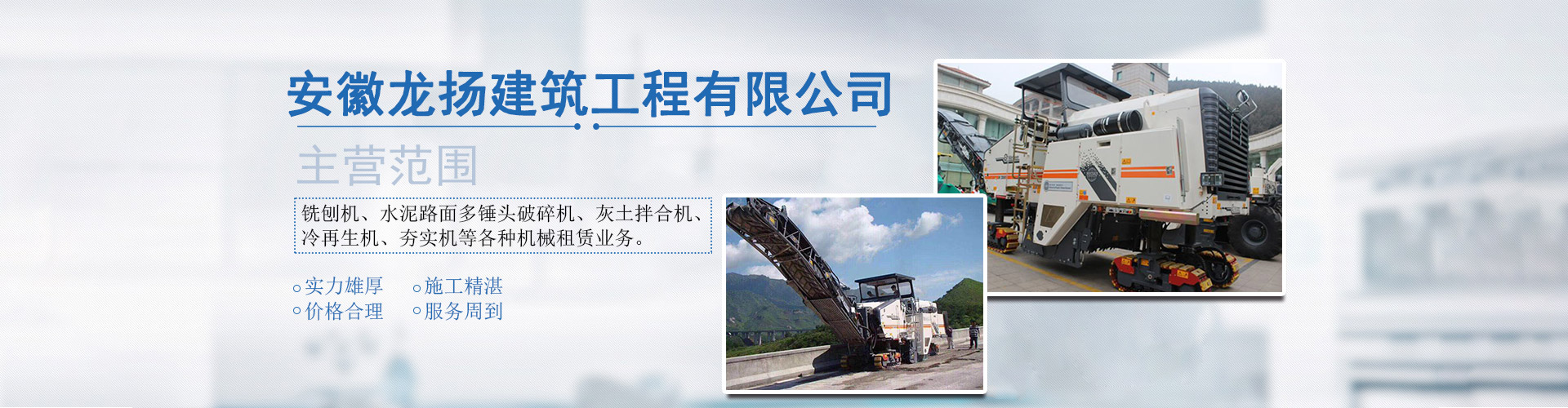 安徽龍揚(yáng)建筑工程有限公司是一家知名的大型建筑機(jī)械租賃企業(yè)之一。公司管理完善,組織機(jī)構(gòu)健全,技術(shù)力量雄厚。經(jīng)營(yíng)范圍:銑刨機(jī)、水泥路面多錘頭破碎機(jī)、灰土拌合機(jī)、冷再生機(jī)、夯實(shí)機(jī)、攤鋪機(jī)、挖掘機(jī)、粉料撒布車(chē)、平地機(jī)、清掃機(jī)、壓路機(jī)等各種機(jī)械租憑業(yè)務(wù)。另承接石灰、沙石、水穩(wěn)攤鋪等業(yè)務(wù)。廣泛服務(wù)于農(nóng)業(yè)建設(shè)、小區(qū)綠化、場(chǎng)地平整、鐵路、高速公路等建設(shè)。公司業(yè)務(wù)范圍廣泛,在外省等地服務(wù)過(guò)數(shù)百處大中型建筑工程,與客戶(hù)建立了良好的合作關(guān)系,參加建設(shè)了云南、四川、貴州等省市區(qū)數(shù)百處市工程和大型公建及住宅項(xiàng)目,公司成立以來(lái)通過(guò)嚴(yán)格的管理和務(wù)實(shí)的經(jīng)營(yíng)理念,在同行業(yè)中樹(shù)立了較高的信譽(yù)。